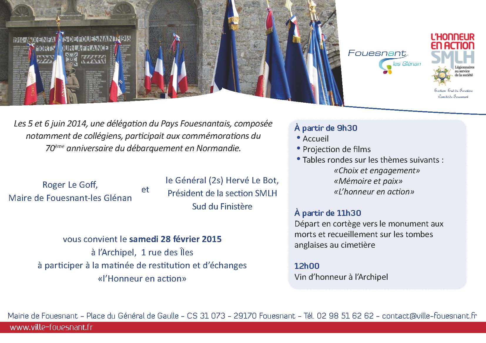En juin 2014, nous avions effectué un déplacement inoubliable en Normandie avec le collège Saint Joseph et la Reaschule de Osterath à l’occasion du 70ème anniversaire du débarquement. La Mairie de Fouesnant et la Société des Membres de la Légion d’Honneur vous convient à une matinée de restitution de ce déplacement le samedi 28 février à partir de 9h30 à l’Archipel.