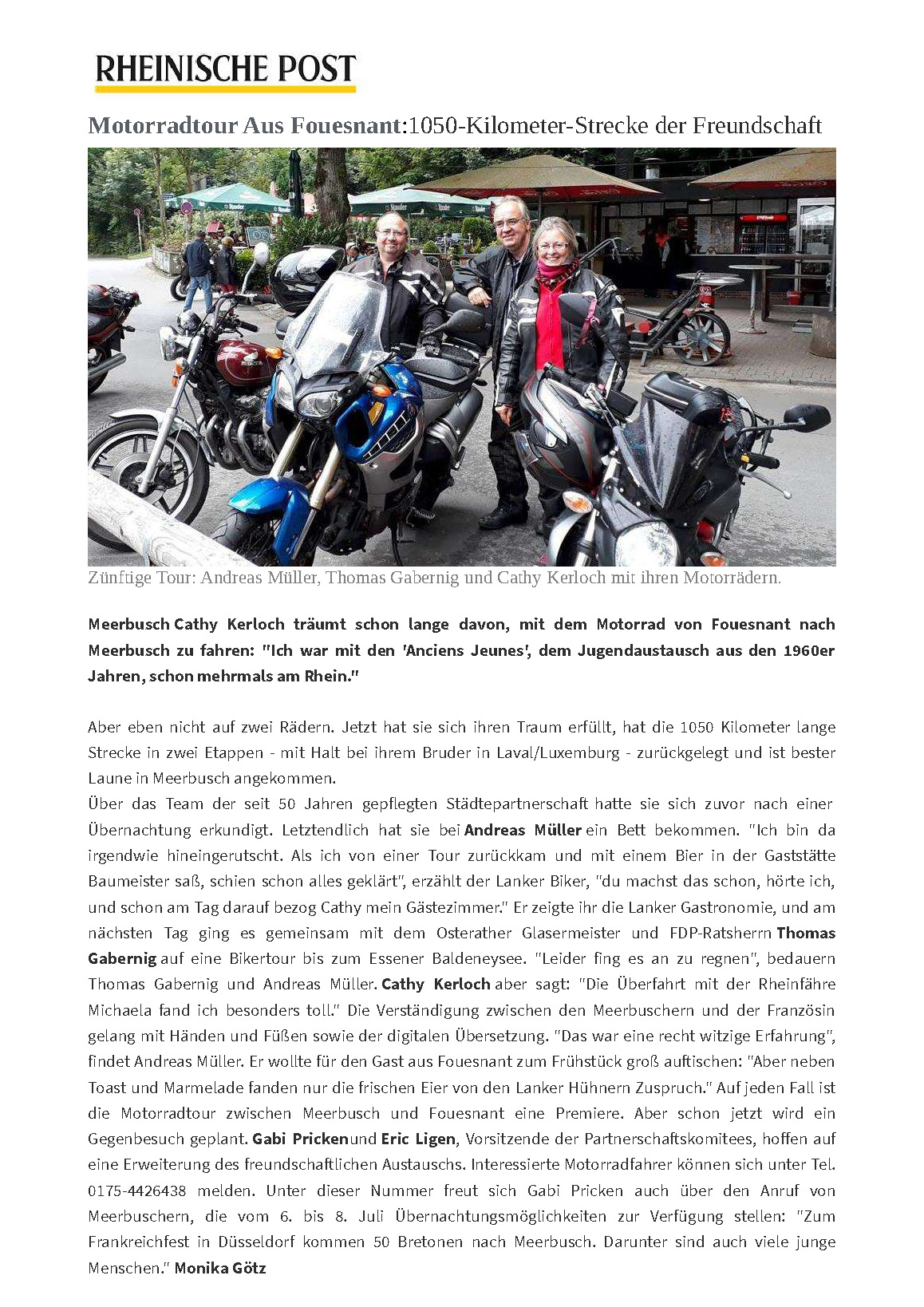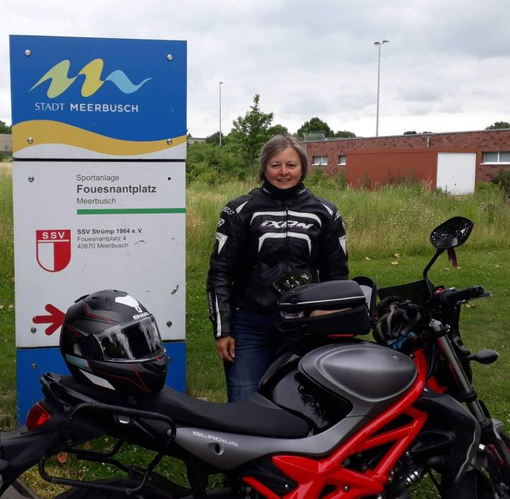 Il fallait oser ! 1050 Km seule, à moto. Mais au bout du trajet, de belles rencontres avec Andreas Müller et Thomas Gabernig avec qui elle a pu faire une sortie dans les environs de Meerbusch. Merci à eux pour leur accueil chaleureux. Et à bientôt à Fouesnant pour, espérons-le, le début d’échanges réguliers entre bikers de Fouesnant et Meerbusch.
