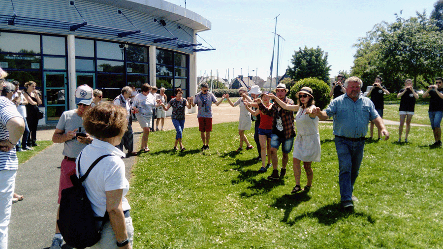 Freitags konnte die Gruppe einen Spaziergang zwischen La Forêt-Fouesnant und Cap Coz machen. Bei der Ankunft wartete die Musikgruppe Bagad Bro Foën auf die Meerbuscher Gruppe und einige lernten dann noch bretonischer Tanz. Das vom Partnerschaftskomitée angebotene Buffet wurde vor dem Segelzentrum Cap Coz aufgebaut. Viele machten sich dann unter der Sommersonne auf den Weg zum Strand.