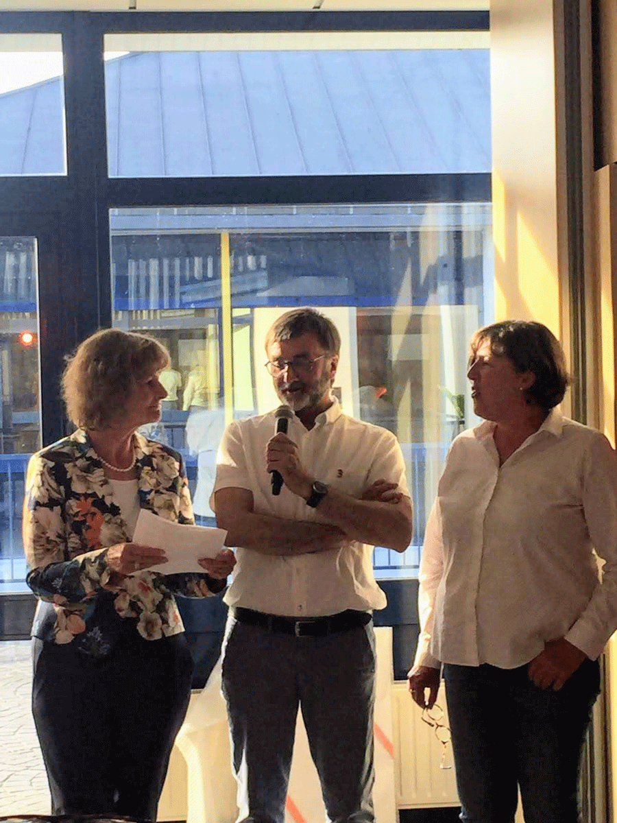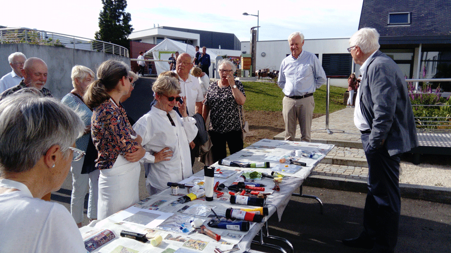 Beim Aperitiv hatte die Meerbuscher Künstlerin Matre ihre Presse installiert und jeder konnte ein kleines Kunstwerk auf Papier drucken und so ein Andenken an dieses schöne Wochenende behalten. Der Koch der Stadt Cyrille Bujard und sein Team hatte ein Abendessen von sehr hoher Qualität zubereitet, das alle Gäste beeindruckte.