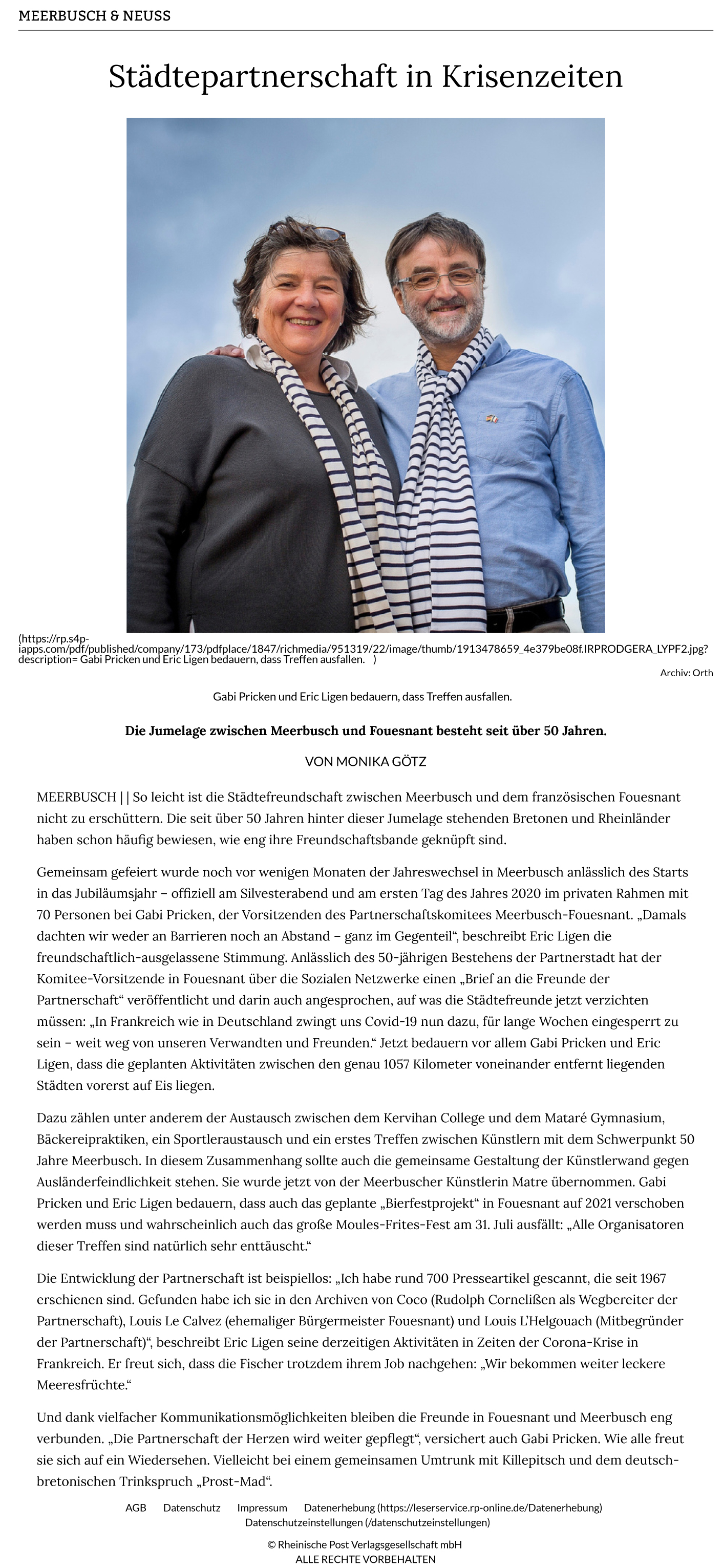 Cela n’était jamais arrivé en 53 ans : les échanges prévus en 2020 ont dû être tous annulés jusqu’à présent. Notre amie Monika Götz, journaliste pour le Rheinische Post, relate la situation et l’état d’esprit qui nous anime à Fouesnant et Meerbusch.