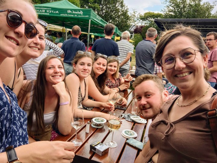 Der Abend fand dann am anderen Ufer statt, auf dem Campingplatz in Meerbusch, wo Tische, Bänke und Buffets aufgebaut waren. Bei herrlichem Sonnenschein lernte die gesamte Gruppe einander besser kennen, insbesondere den Bürgermeister Christian Bommers, den wir zum ersten Mal sahen.